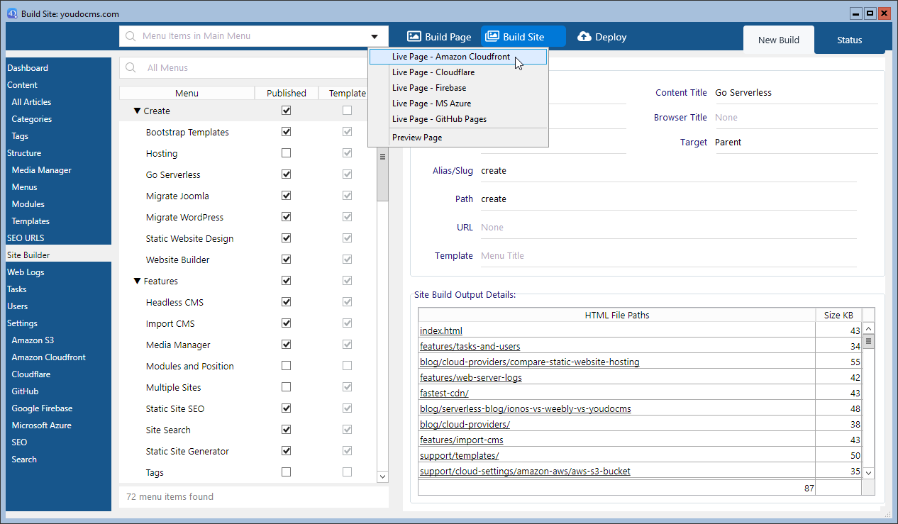 Our headless cms is integrated with the major cloud API's for serverless deployment. Create a custom domain, set up SSL certificates, build, verify and deploy your site in minutes. Build to test or switch multiple sites and multiple CDN's supported.