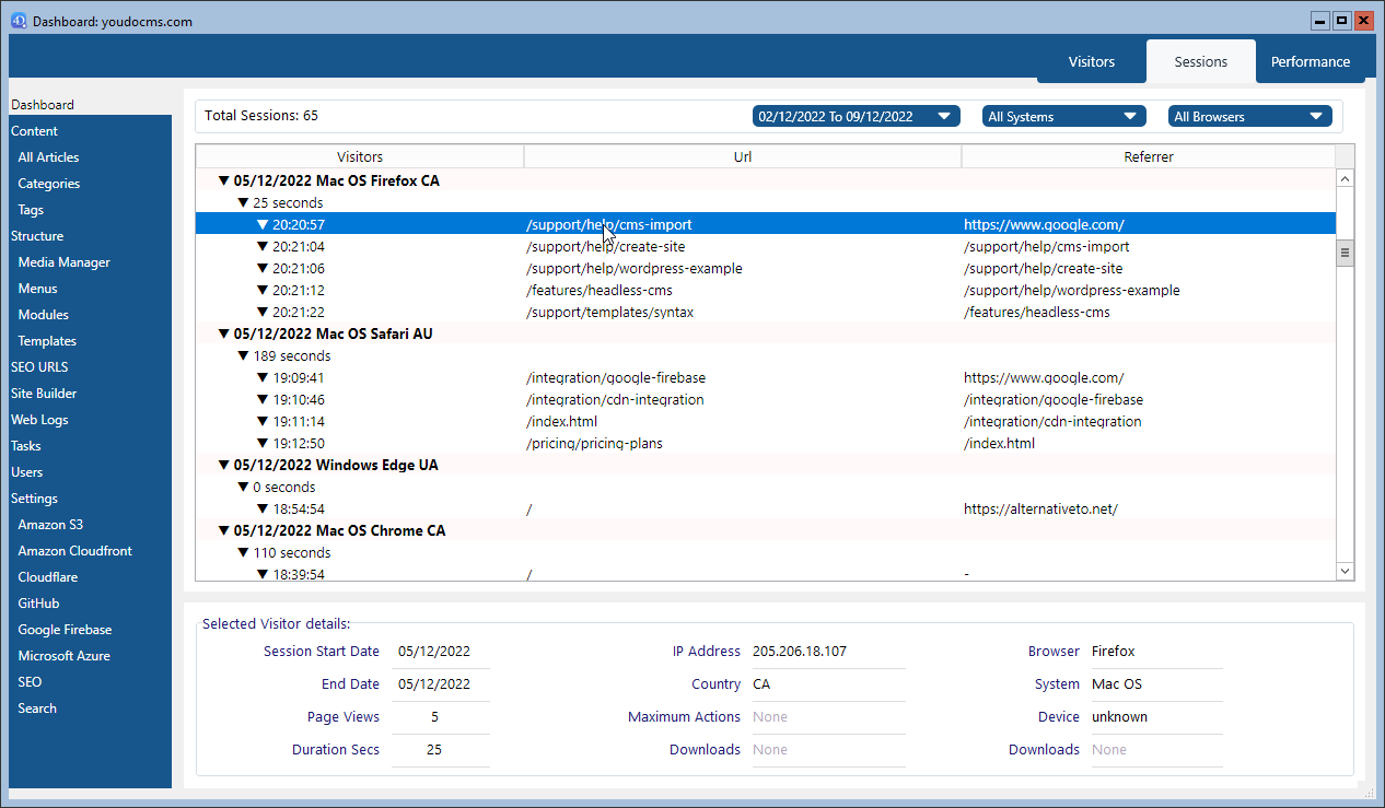 Common visitor metrics such as browser type, OS, device, IP address and country. Session data including page views, session duration and bounce rate. Create actions by URL for example downloads. Monitor performance with top entry and exit pages.