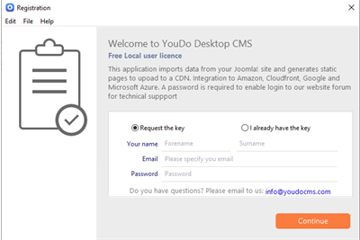 Customer support is available via email or preferably using our discourse community forum. Our normal working hours are Monday to Friday 09:00 to 18:00 GMT. YouDoCMS is a desktop application available for Windows 7,8 and 10 x64 and OSX 10.14+. After installation routine you will need to register the software with a valid email address.