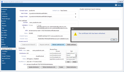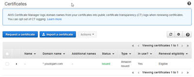 Go to file preferences Amazon CloudFront tab. A certificate request can be made via DNS or email. Either way you will need to amend entries in your DNS settings for the domain so the best option is to use DNS verification.